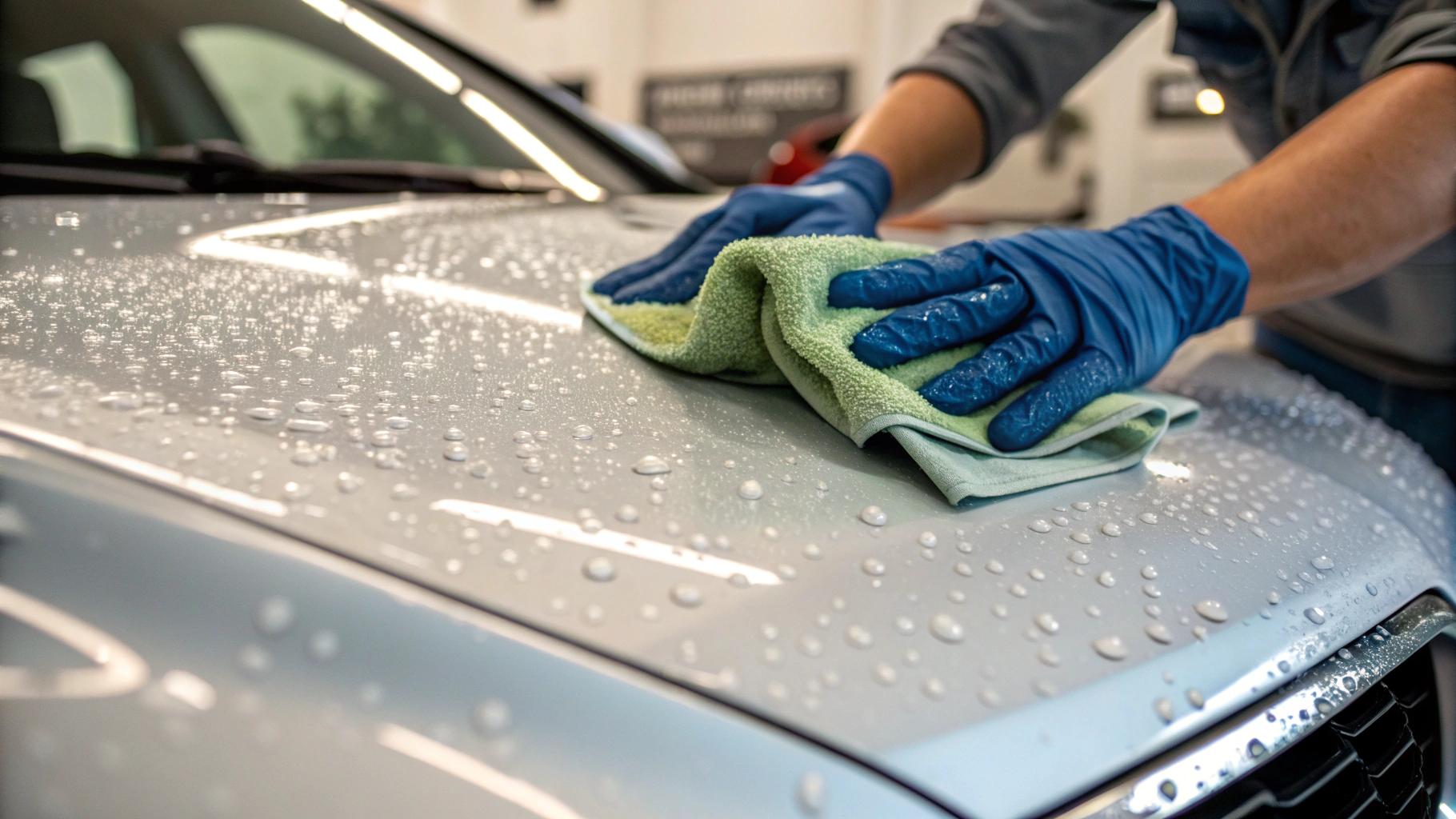 Sprawdź stan lakieru pod powłoką: jeśli są głębokie zarysowania, najpierw skoryguj polerowaniem. Susz wodą demineralizowaną, by uniknąć osadów mineralnych.