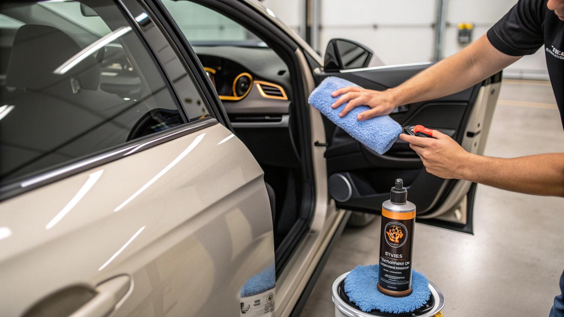 Następnie odtłuść lakier alkoholem izopropylowym lub IPA (70-90%), spryskując panel po panelu i wycierając mikrofibrą. To usuwa tłuste osady zimy. Unikaj słońca, by zapobiec smugom – idealna temperatura to powyżej 5°C.